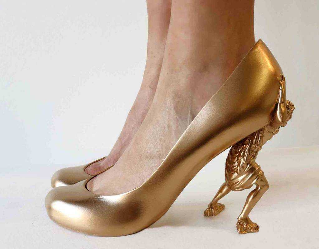 Но необычные мокасины, по крайней мере, удобны в носке и удивляют только внешним видом. А вот уникальная обувь для женщин имеет порой такие причудливые формы, что и устоять в ней сложно, не то чтобы передвигаться.