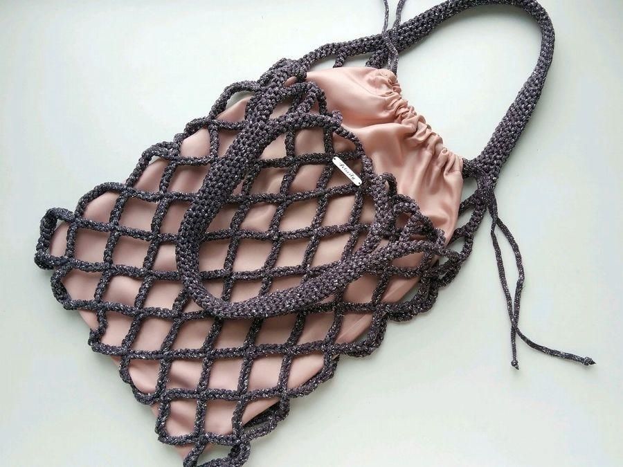 Еще один вариант авоськи на каждый день. Миниатюрная сумочка из полиэфирного шнура необычного цвета с шелковым мешочком на завязках впечатлит любую модницу!