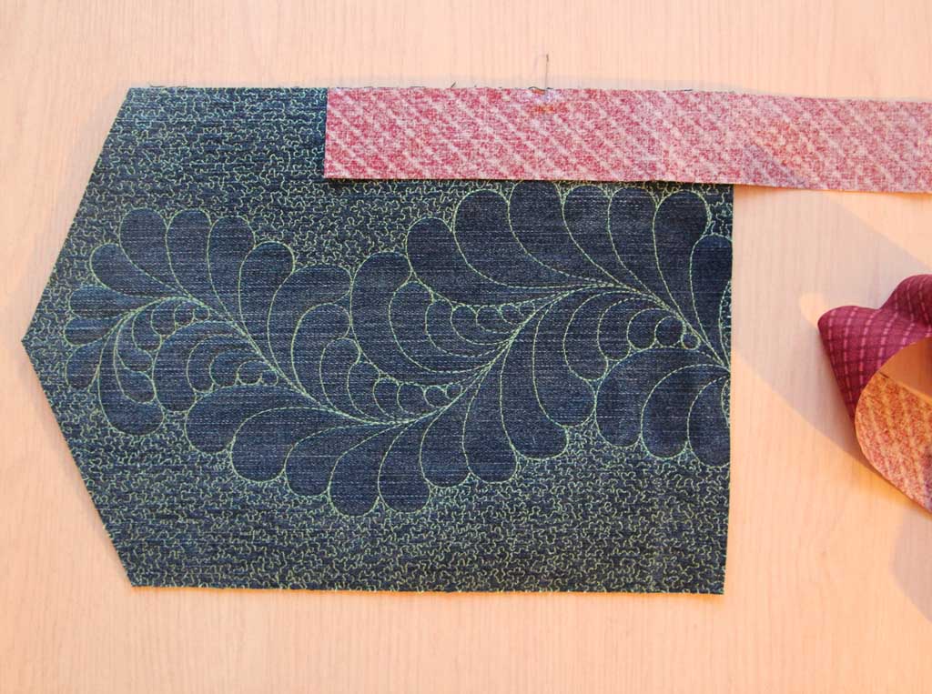 Теперь наш карман надо окантовать. Для окантовки выкраиваем долевую полоску шириной 3,8 см (при припуске 0,75 см). С лицевой стороны пристрачиваем полоску на ширину припуска.