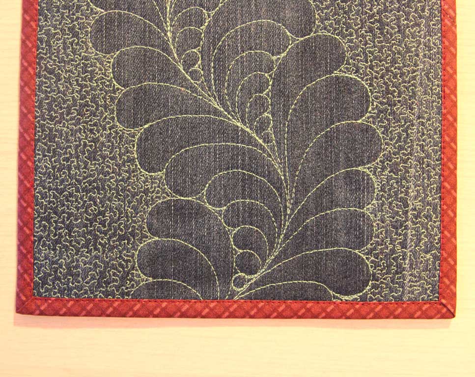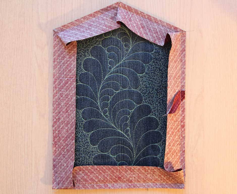 Сэндвич простёгиваем. Я простегала свободноходовой стёжкой. Можно простегать прямой строчкой, например, в клеточку, с использованием лапки с верхним транспортёром. Обрезаем нашу заготовку по выкройке.