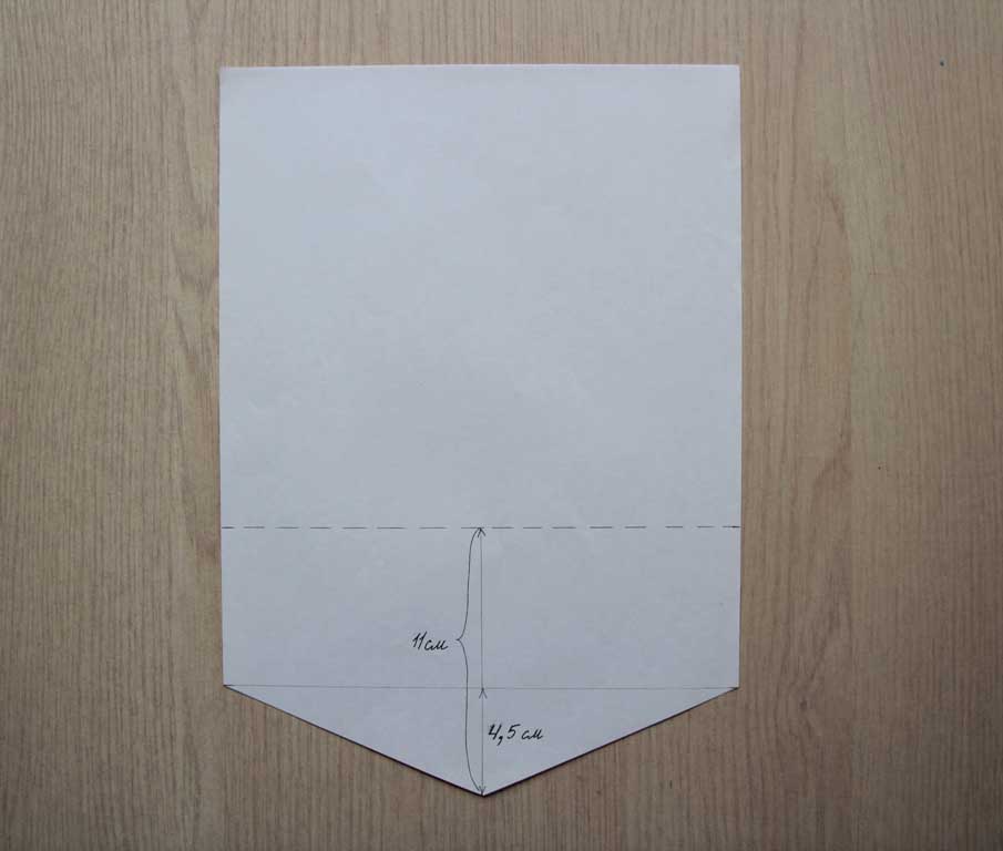 Чертим выкройку кармашка: берём лист А4. На короткой стороне находим середину, откладываем вверх расстояние 4,5 см, проводим линию, откладываем ещё одно расстояние 11 см, проводим пунктир. Соединяем середину с точками по бокам, которые получились при откладывании 4,5 см. Эти углы обрезаем. Получилась выкройка кармашка.