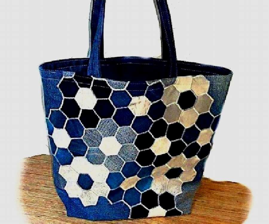 Джинсовая сумка-авоська выполнена в стиле пэчворк. Шестиугольники смотрятся как цветы, напоминая одновременно о ячейках классической авоськи.