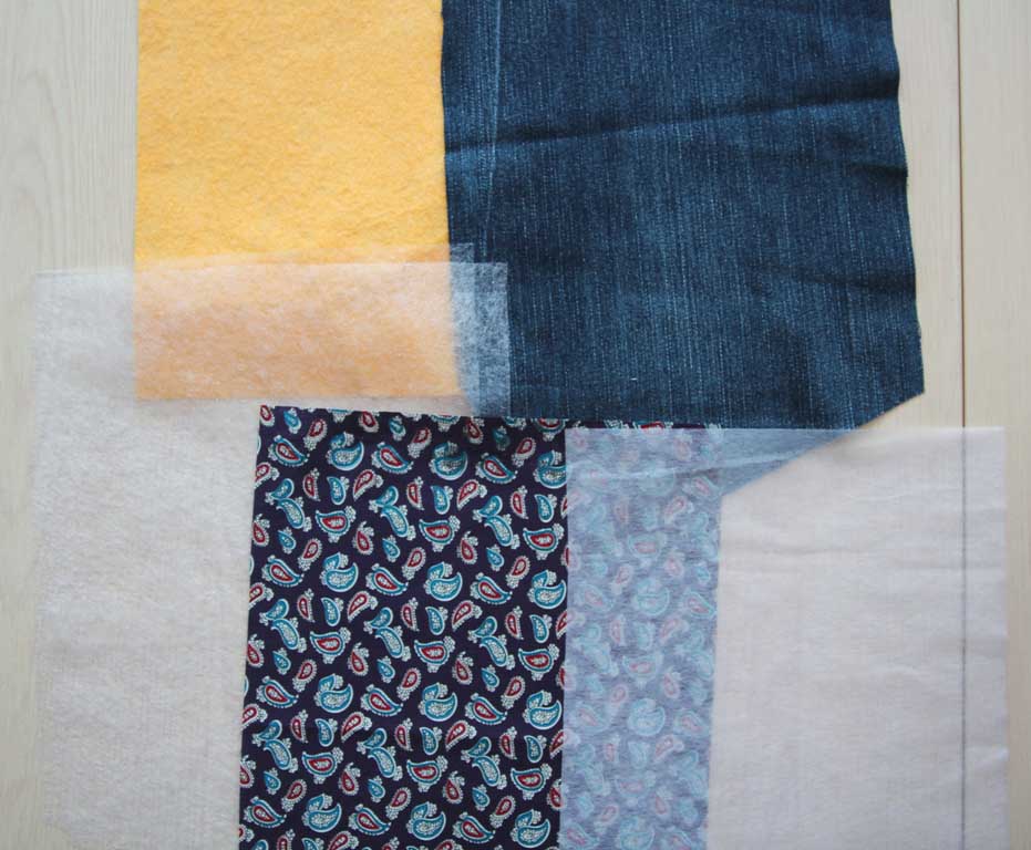 — материалы для кармашка (кусочек джинсы, подкладочная ткань, прокладка – в моём случае вискозная салфетка для уборки, паутинка для скрепления слоёв, клеевой флизелин)
