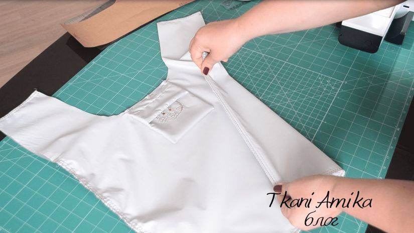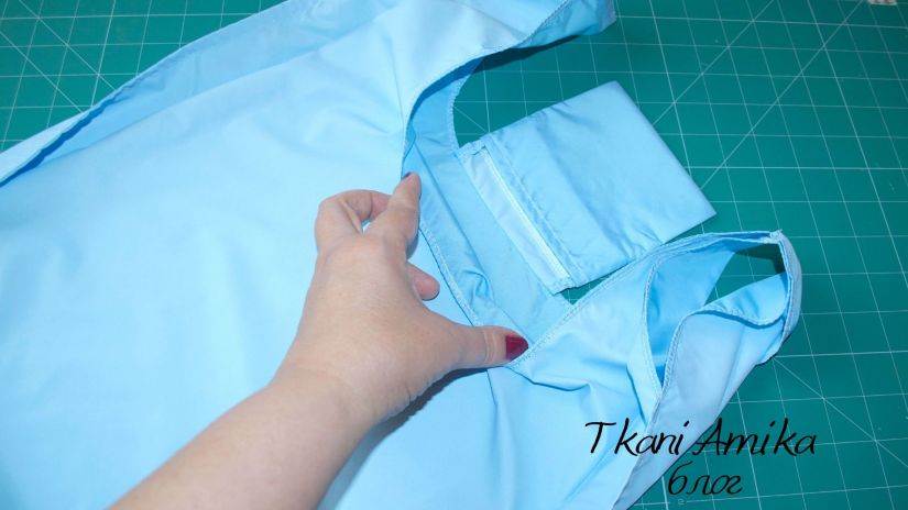 На ручках из голубой ткани припуски согнуть внутрь, и заутюжить их утюгом.