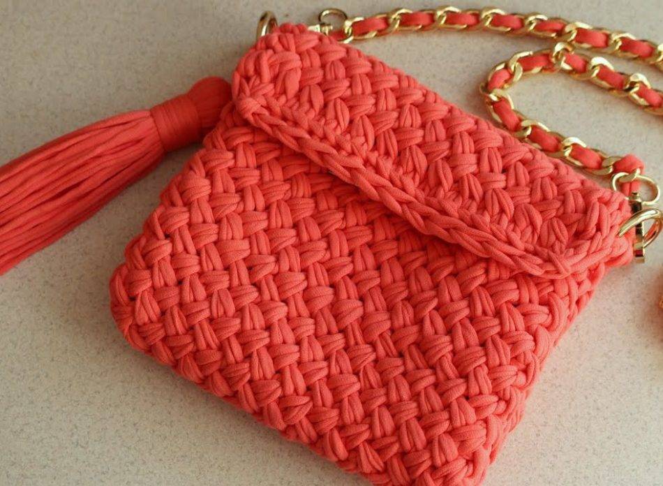 Самым практичным материалом для вязаных сумок считается трикотаж. Выпускаются нитки в мотках или бобинах, длина может достигать 200 метров. Трикотажные ленты недорогие, выглядят достаточно просто – связанный из них аксессуар, скорее, подойдет для повседневной носки.