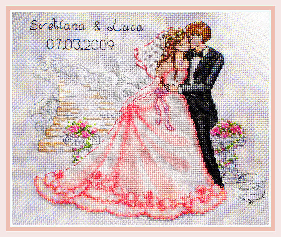 Как вариант можно использовать в качестве схемы для вышивки фотографию, обработанную в специальной компьютерной программе Stitch Art Easy. Если это подарок по случаю помолвки, то можно за основу метрики взять любую фотографию молодых и добавить обручальные кольца или изображение свадебного дерева. В качестве подписи можно вышить фразу “навеки вместе”, “любовь навсегда” или какое-то выражение из лексикона молодоженов, вписывающееся в эту композицию. Также можно создать композицию, в которой будут объедены и фотография и вышивка. Такой подарок, бесспорно, понравится всем.
