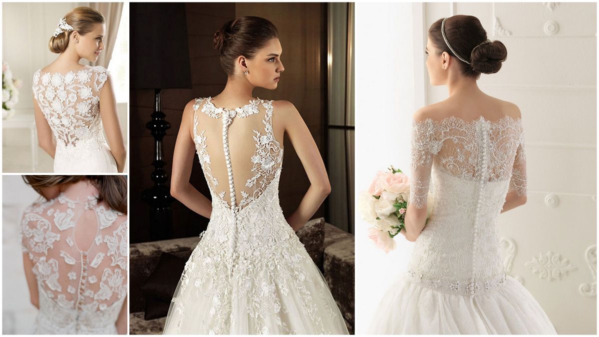 Когда невеста выбирает платье с открытой спиной или с большим вырезом на спине, поверх него можно надеть кружевную накидку или болеро. В некоторых платьях интересно обыгрывается сам вырез с помощью кружевной отделки, также из кружева выполняются ворот и рукава.