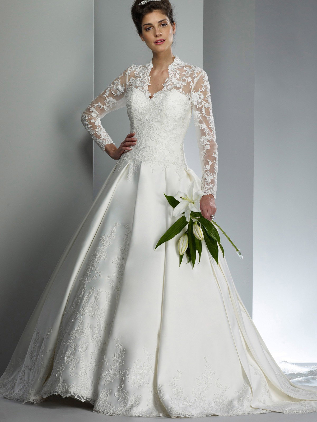 Классический и даже королевский вид создаст белое,длинное свадебное платье с пышной юбкой и расклешенными длинными кружевными рукавами. Достаточно вспомнить свадебный наряд недавно ставшей королевской особой Кейт Миддлтон, чтобы понять, как интересно смотрится этот вариант. Но девушкам низкого роста стоит осмотрительнее относиться к подобным моделям, они могут сделать вас визуально шире.