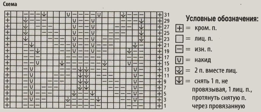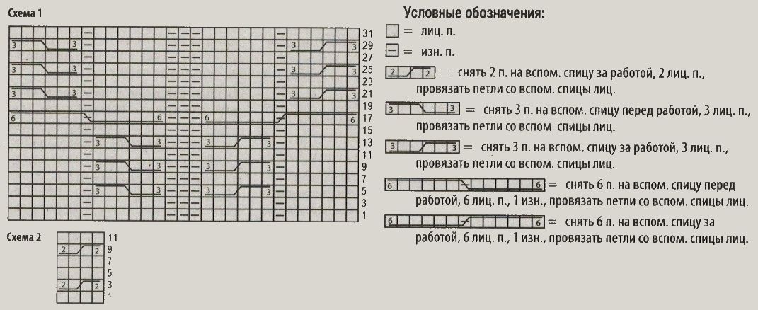 Основной узор: вяжите по схеме 1, на которой даны и лиц., и изн. ряды.