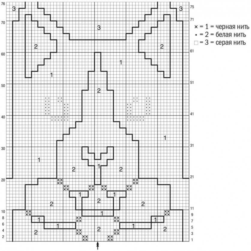 Резинку сделать такую же, как мы делали на спине. Далее, начинаем делать рисунок кота: на спицах 3,5 мм. Далее, останавливаемся на лицевом р. и делаем рисунок: 18 (22) п. светло-серого цвета, 58 п. – по схеме, 18 (22) п. светло-серого цвета. Для удобства находим середину рисунка и отмечаем её булавкой (на рисунке – стрелка). Далее, вяжем по схеме. Когда схема закончена – лицевой гладью светло-серого (основного) цвета.