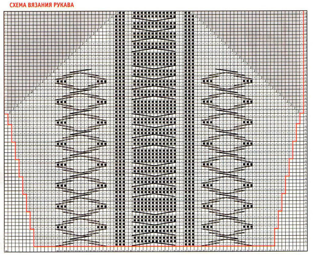 - На спицах оказалось 52 петли, опосля чего же вяжем рукав свитера спицами №4,5. Средние 10 петель ряда вяжутся узором по прилагаемой схеме, а другие (по 21 слева и справа) платочной вязкой.