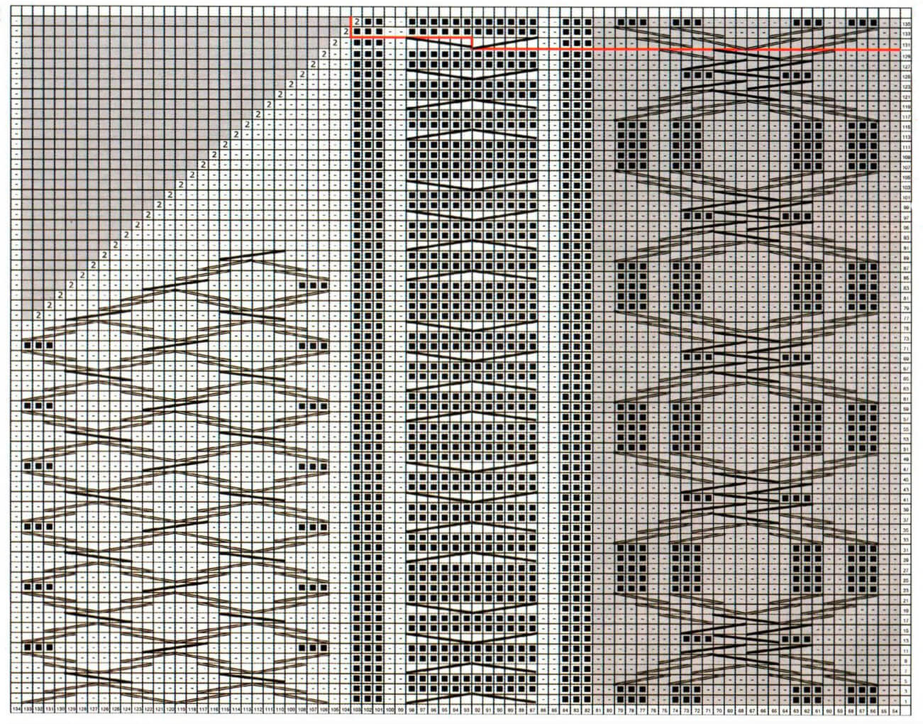 Читаем схему справа налево; центральное переплетение, выделенное серым фоном, вяжем 1 раз. При чтении 2-й части схемы центральное переплетение не повторяем, оно приведено для удобства работы со схемой.