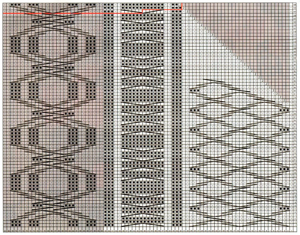 Начинаем вязать по основной схеме, на которой не указаны кромочные петли. Для удобства чтения схема разделена на 2 части.
