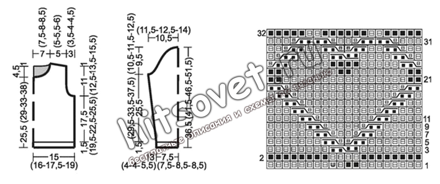 Через 17,5 (19,5; 22,5; 25,5) см = 65 (73, 83, 95) рядов от нижней планки = 69 (71, 77, 81) петель выполнить проймы, как на спинке.