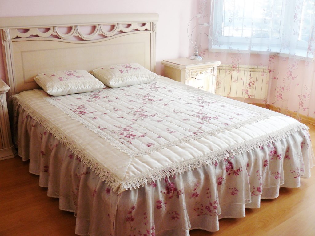 Покрывало традиционно закрывает весь матрас, а не просто лежит поверх одеяла. Шторы, к примеру, должны быть немного задрапированы, а по длине доходить до пола, но не лежать на нем