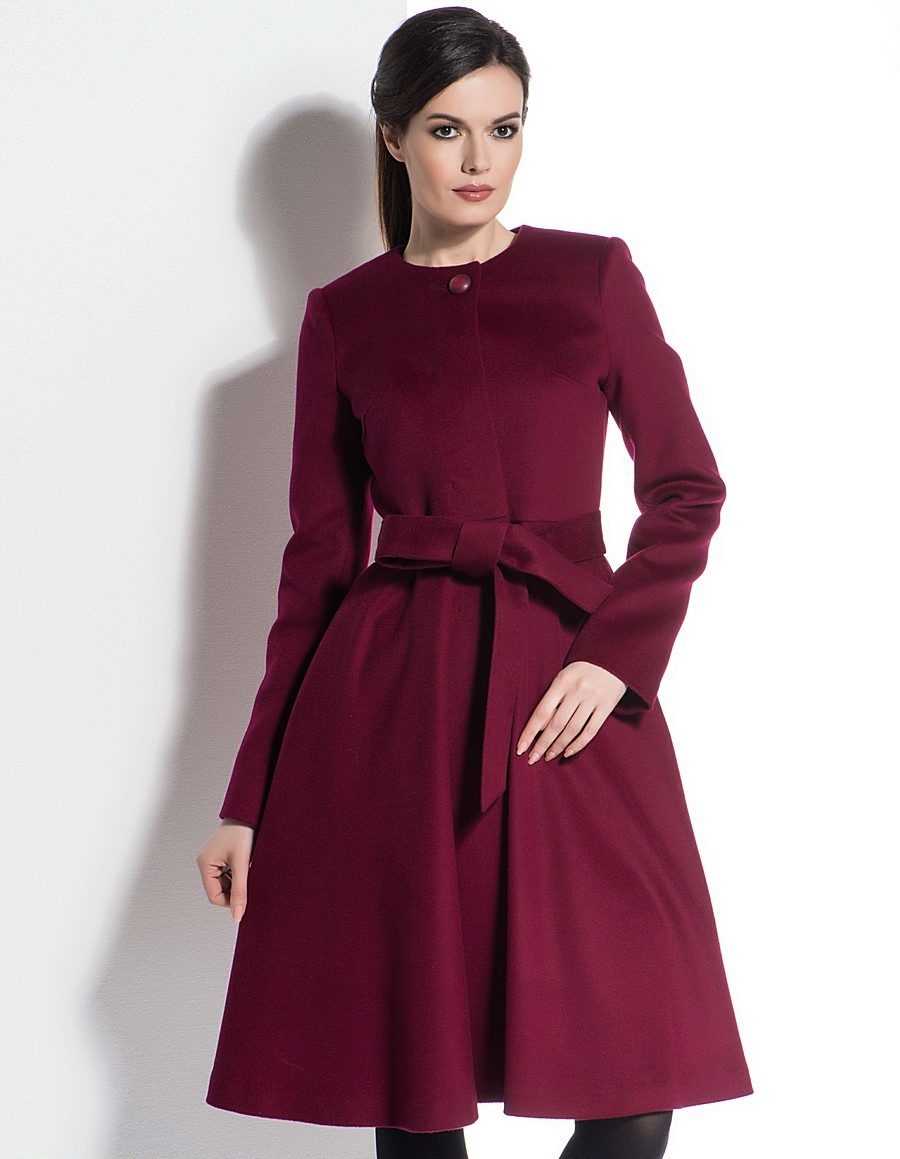 Нежно малиновый цвет или более глубокий широко распространен в создании верхней одежды. С наступлением холодов настроение ухудшается, малиновый мягкий цвет прекрасно справится с устранением осенней хандры. Длина пальто предпочтительна до колена, она универсальна под платья, брюки, юбки. Классический английский фасон с воротом стойкой востребован под любой тип фигуры. Стройным барышням выгоден приталенный вариант. В тренде оверсайз размер свободного кроя, А-образный силуэт, летучая мышь.