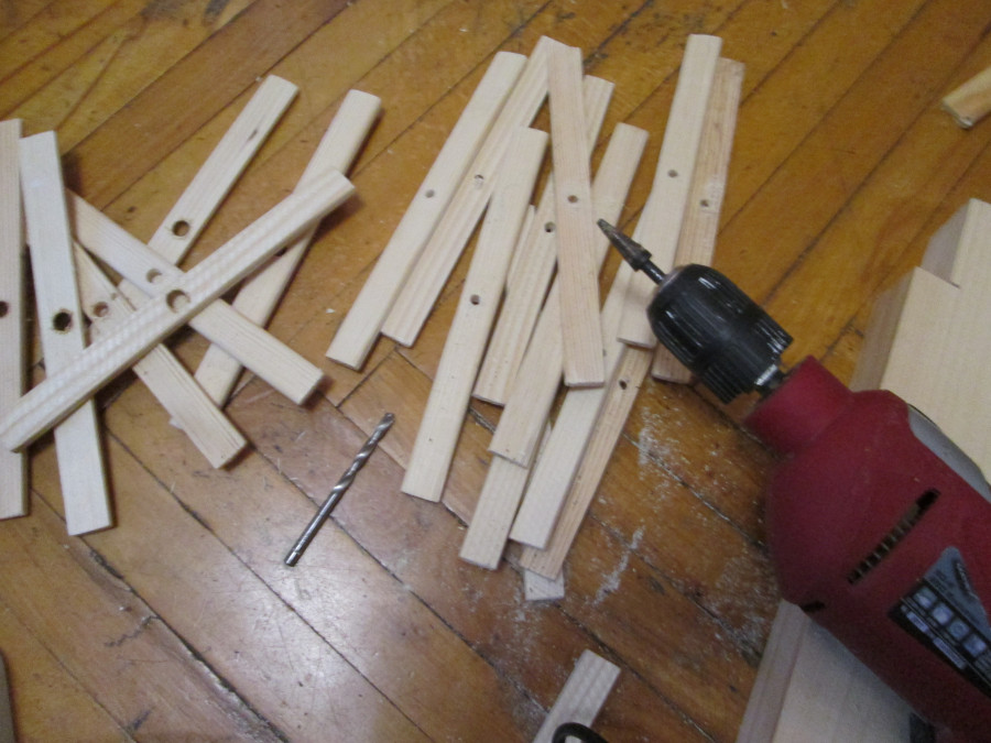 На каждой в центре размерила место для отверстия.Отверстия просверлила сверлом 6 мм, а потом (на весу с обеих сторон) еще и шарошкой пирамидальной формы (в основании 1,5 см.) до размера диаметра отверстия 1 см.Края планок зачистила напильником, а края отверстий полукруглым надфилем.