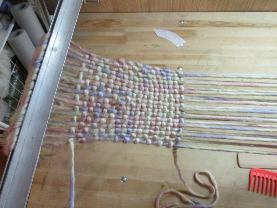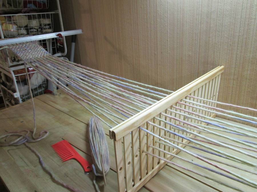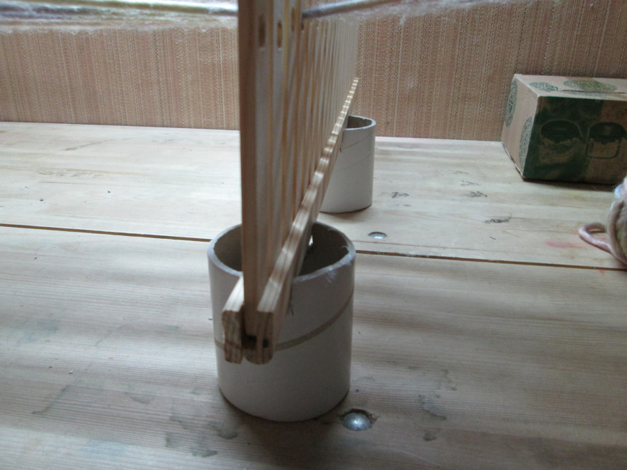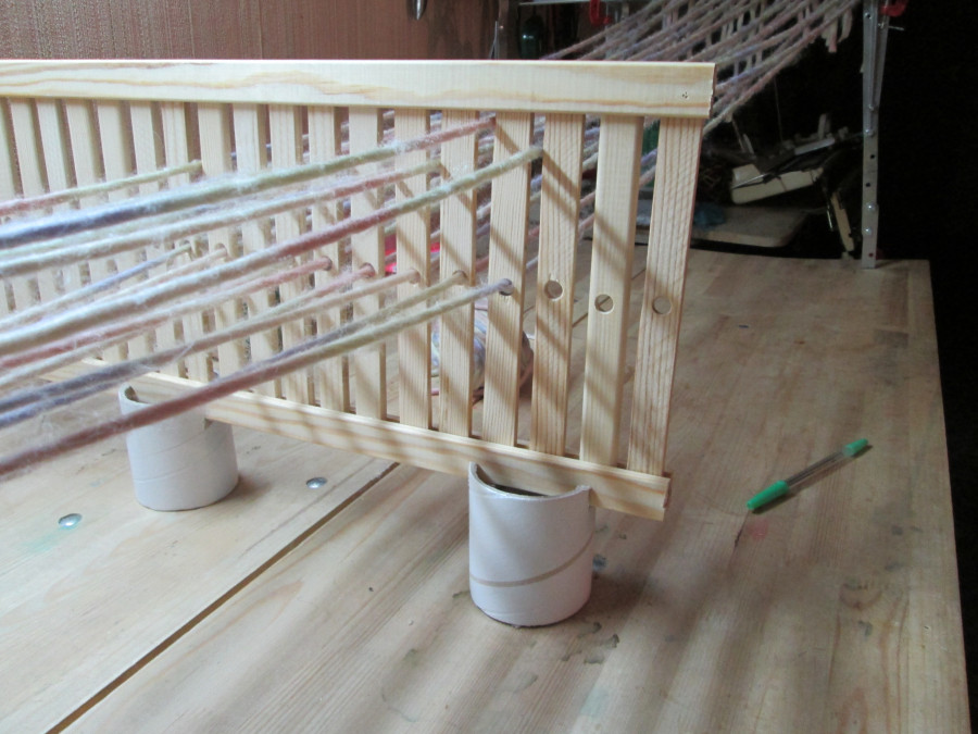 Поскольку бердо постоянно заваливалось набок, пришлось придумать подставки. Ими послужили два картонных цилиндра, на которых была намотана ленточная пряжа. Я просто сделала в них пропилы и загнула их вовнутрь. Таким образом, когда бердо стояло на столе, я протягивала челнок с ровницей в одну сторону, а когда я приподнимала бердо над столом, положение нитей менялось (те, что были снизу, оказывались сверху), и челнок протягивался в другую сторону. Это значительно упрощало процесс и уменьшило затраты времени на плетение.