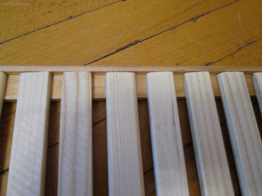 Короткие планки я разрезала ножовкой пополам — это будут верх и низ бердышка. Длинные (которые шириной 2,2 см) нарезала длиной по 22 см. Нарезая, я прикладывала короткие планки перпендикулярно к длинной, чтобы знать, сколько штук поместится.