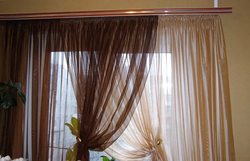 Оба вида шторных тканей могут быть подобраны в одной цветовой гамме или, напротив, в контрастных оттенках. Это зависит от назначения комнаты.