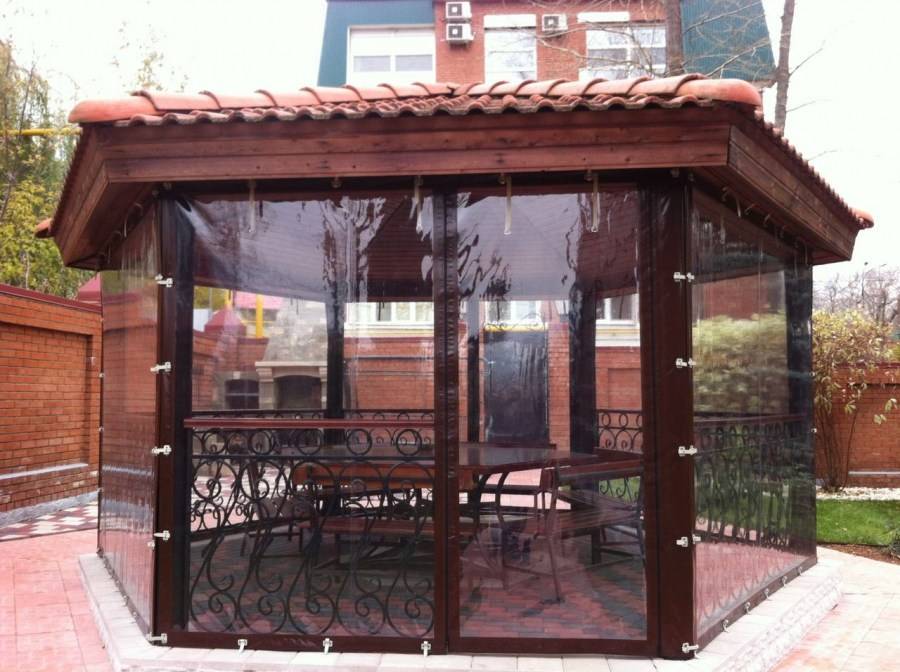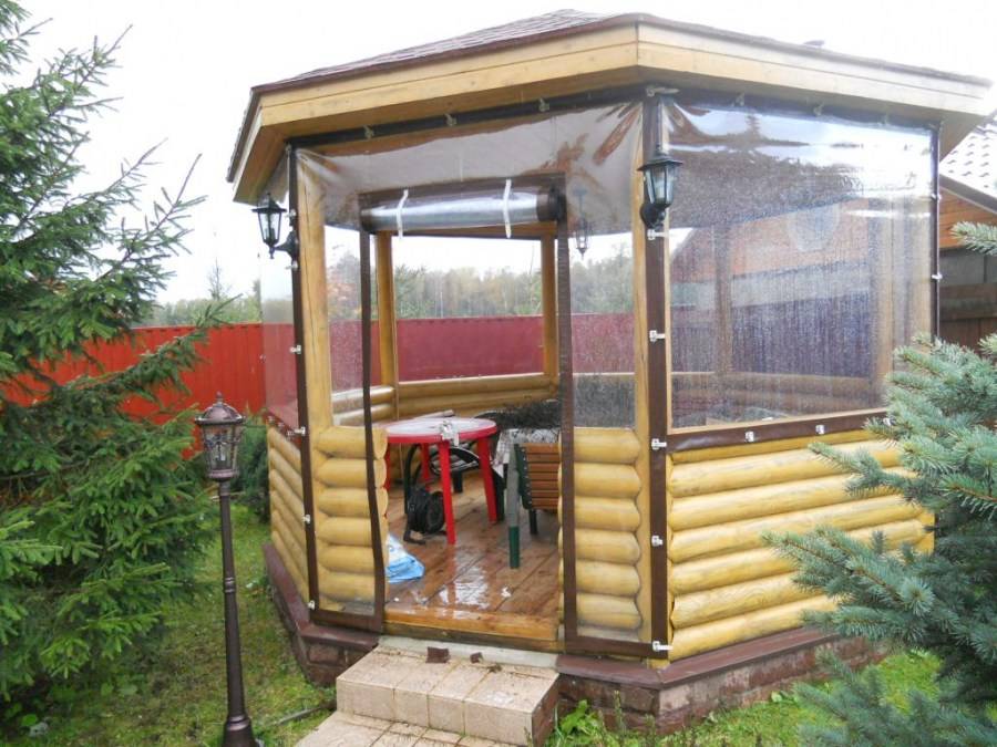 - Полотна из ПХВ или защитные шторы из брезента используют в беседках, выходящих на проезжую часть.