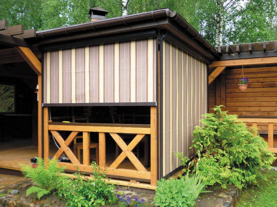 Отдельно хотелось бы сказать о шторах из натуральных материалов: из бамбука, веревочные из пеньки, соломки, деревянных. Такие жалюзи для беседок и веранд естественным образом вписываются в ландшафтный дизайн и подчеркивают эко стиль постройки, а особенно хороши в деревянных беседках.