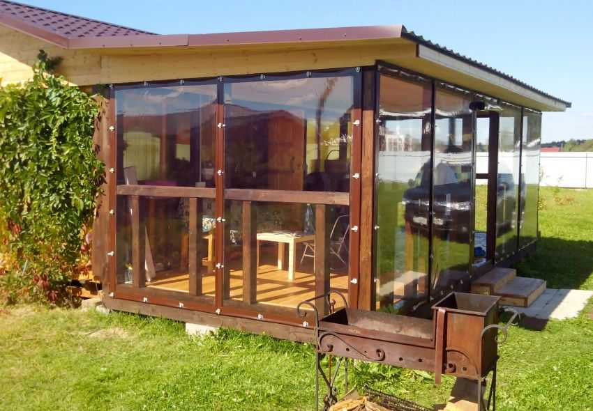 Поскольку защита поликарбонатом стационарная, будет много сложностей с демонтажем конструкции. В летнее время она будет сильно нагреваться и может создавать парниковый эффект для отдыхающих. Также этот материал заметно хуже пропускает свет. Поэтому специалисты отдают предпочтение уличным шторам и мягким окнам.