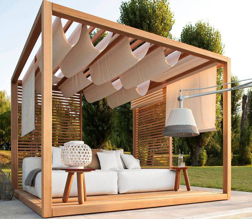 В теплое время года используют обычный текстиль. Его можно применить как для застекленного варианта беседки, так и для открытых веранд. Шелк и шифон способны добавить романтичность, а также дают возможность насладиться свежим воздухом и легким ветром. Часто встречаются более плотные виды тканей, что можно увидеть на многочисленных фото дизайна беседок. Лидирующие позиции занимают лен и парусина.