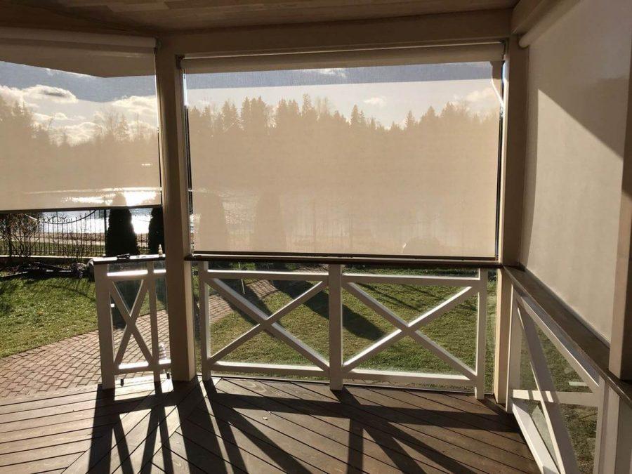 Украшает террасу или беседку и защищает от атмосферных осадков и ультрафиолета. Прочное полотно выдерживает механические повреждения в виде царапин или порезов. Рулонные шторы закрепляют в специальных пазах, обеспечивающих полную герметичность при закрытии. Использование помещения в холодное время возможно при дополнительном обогреве изнутри. Светонепроницаемость и способность удерживать тепло характеризуют акриловую защиту летних построек на улице.