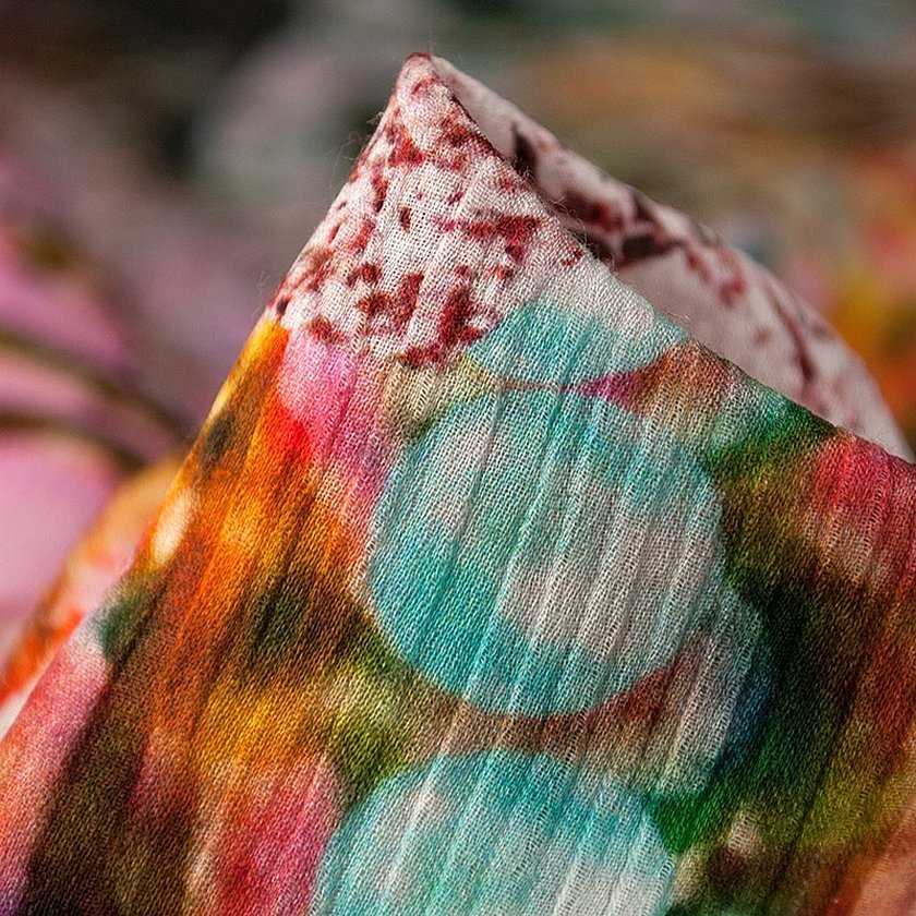 - Креп-жоржет – практически прозрачная и упругая ткань из 100% шелка, вискозы, синтетики или смесовых волокон. Из него шьют преимущественно шейные аксессуары (платки, шарфы или палантины), а также летние женские наряды.