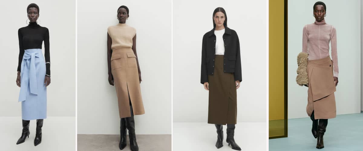 Если бы нам пришлось выбирать, мы бы выбрали один юбка в теплых тонах создать наряд такого типа. Один, пожалуй, в бежевых или коричневых тонах. И эти теплые цвета являются настоящим трендом и создают тонкий контраст с черными ботинками на геометрическом каблуке и заостренной отделкой, как те, что носят сейчас.