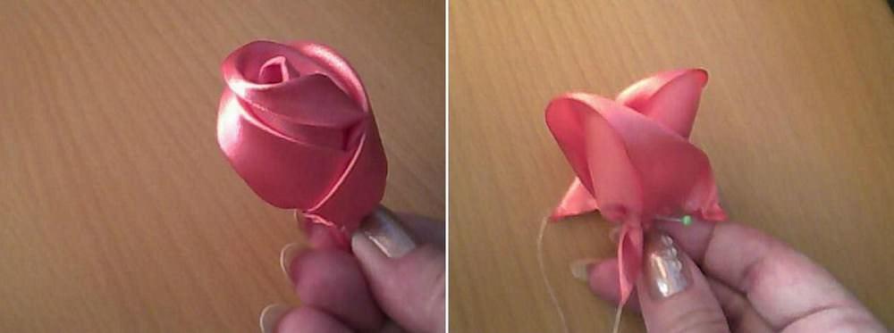 - Когда розочка сформирована, конец ленты подогните, соедините с основанием;