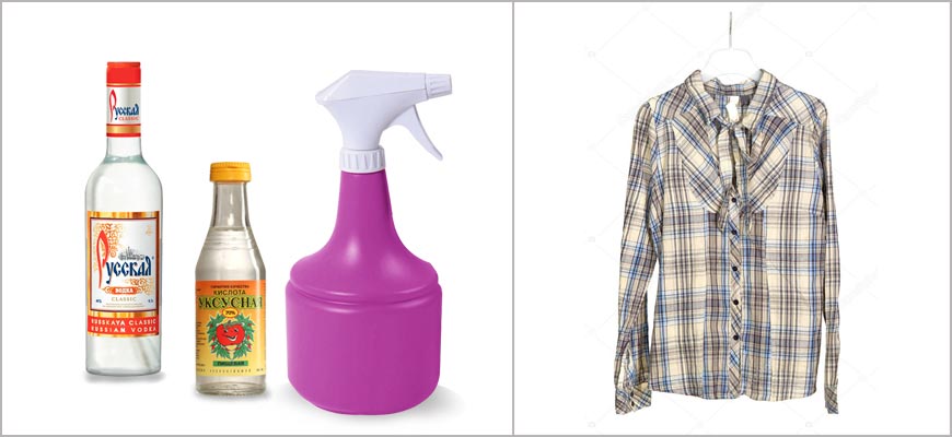 Это средство универсальное и его можно использовать для того, чтобы избавиться от затхлого запаха одежды на любых тканях. Подойдет этиловый спирт и любые неокрашенные продукты с его содержанием. В чистом виде жидкость разводят напополам с водой, заливают в пульверизатор и опрыскивают одежду. Если используют водку или другой спиртосодержащий продукт, добавлять воду не нужно.