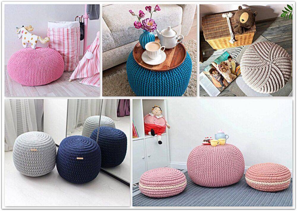Довольно часто из трикотажной нити изготавливают пуфики. Они могут быть большие или маленькие, круглые или квадратные, одноцветные или разноцветные. Конечно, пуфикам нужен наполнитель, но трикотажная пряжа не деформируется под его давлением благодаря своей плотности и прочности. Интересней всего будет выглядеть пуфик круглой формы с цветными вставками. Пуфы нравятся детям своей мягкостью, но такой предмет домашнего интерьера порадует и взрослых.