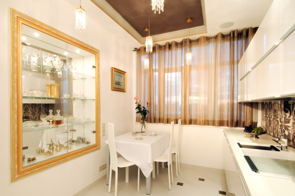 - Не покупайте модели в пол. На кухне актуальнее смотрятся светлые и короткие шторы. В интерьере столовой хорошо будут смотреться длинные полотна.