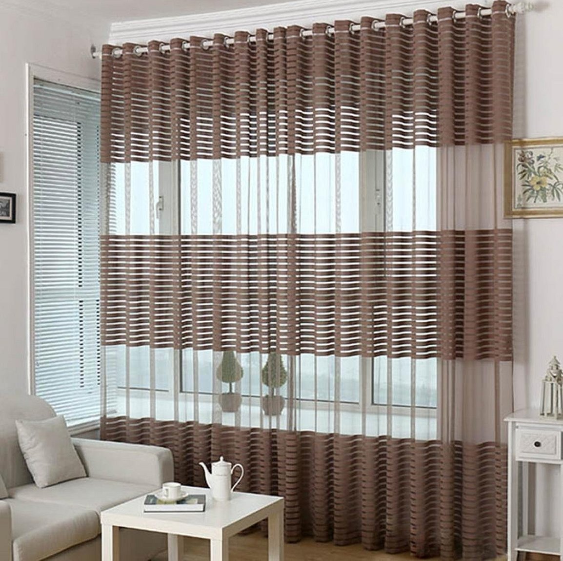 Единственный нюанс, который всегда нужно учитывать при выборе полосатого тюля в интерьере — в темную комнату, не в коем случае нельзя брать темные оттенки, смотреть стоит только в сторону полупрозрачной светлой ткани.