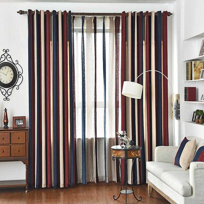 Учитывать нужно и размер помещения. Если пространство небольшое, то можно подобрать недлинные занавески с яркими полосками в жизнерадостных или контрастных цветах.