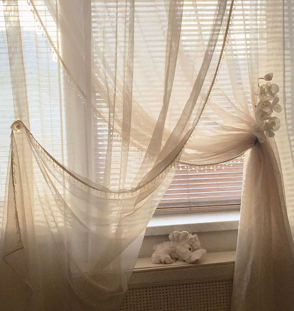 - затем тюль вешают на окно, под общей тяжестью полотно быстро расправляется, красиво драпируется.