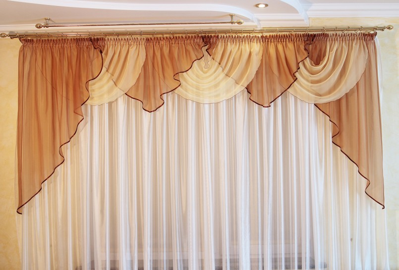 Помните, что нежные, пастельные цвета вуали для штор требуют более насыщенной палитры ламбрекена и, наоборот, к красочным занавесям лучше подобрать декор контрастных, спокойных оттенков.