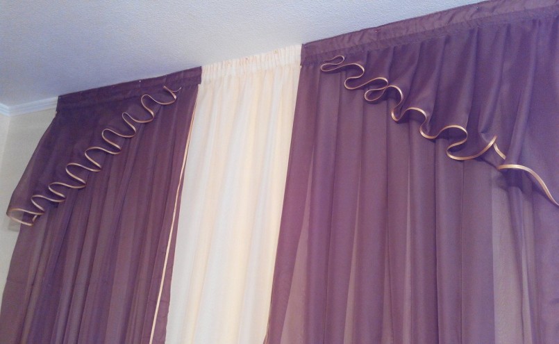 Вы можете купить обычное прямоугольное полотно и при помощи различных аксессуаров придать ему интересную форму. Можно взять два отреза контрастных расцветок, соединить их в верхней части и перекинуть через карниз, получится интересный цветовой эффект. Помните, что этот материал сложен для шитья – лучше отдать такую работу опытному мастеру. Если хотите подрубить полотна самостоятельно, возьмите тонкую иглу и нитку. Если толщина нити будет слишком большой, шов получится неровным и некрасивым.