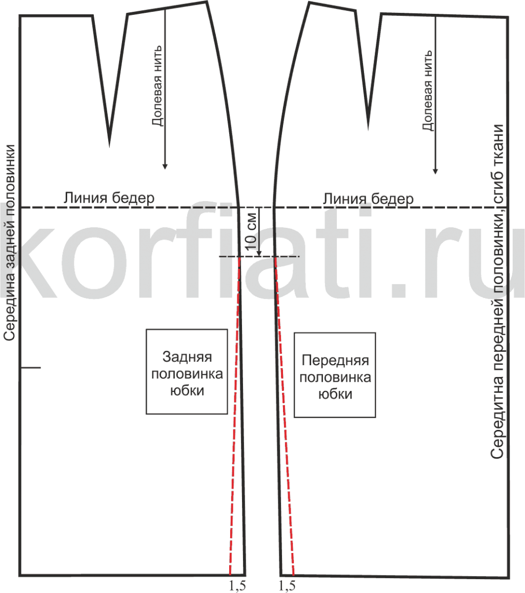 Горизонтальной короткой линией на задней половинке юбки обозначен разрез юбки. Длина разреза рассчитывается по формуле 1/3 длины юбки.