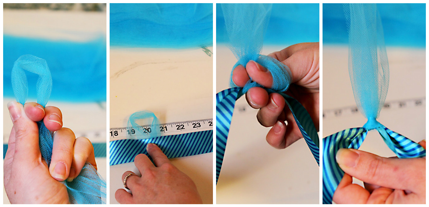 - Из каждой полоски фатина скрутите небольшой ролл, найдите середину и обычным узлом завяжите скрученный фатин вокруг резинки. Нужно следить, чтобы не пережать резинку и при этом завязать тюль так, чтобы полоска не болталась. Кроме того, концы всех срезов тюля должны быть одинаковой длины после связывания, если только вы не планируете делать их разными.