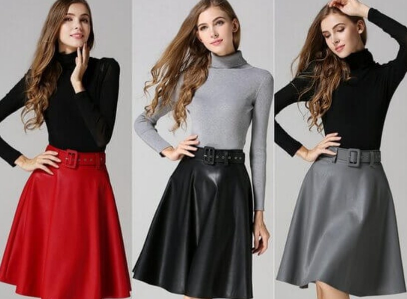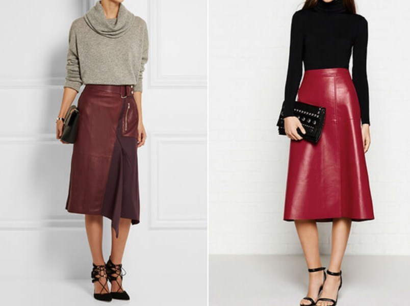 - Кожаная юбка-трапеция помогает скрыть недостатки фигуры и подчеркивает талию.