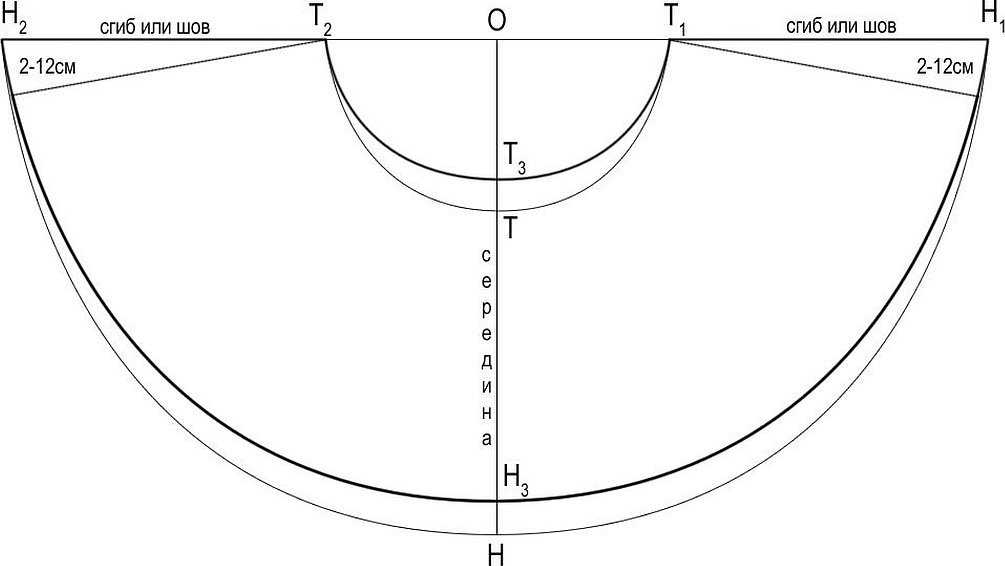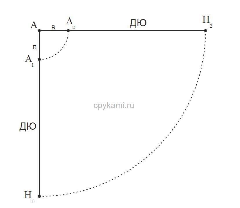 Затем от точек А1 и А2 отмеряем длину юбки. Отмечаем точки Н1 и Н2. Линию низа строим, проведя радиус из точки А. Его величина равна сумме длин АА1 и А1Н1.