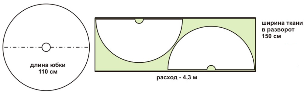 Если ширина ткани позволяет уложить детали в 2 раза, оформив полукруг, то требуется 2 длины юбки + 6 см на подгибку низа.
