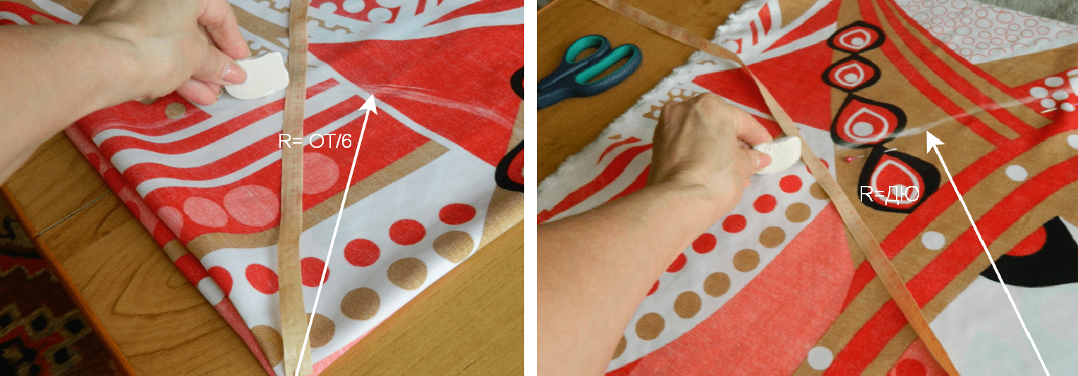 Теперь от угла в круговую откладываем первый радиус 12 см. Мелком очерчиваем, булавочками по бокам фиксируем, чтобы ткань не съехала.