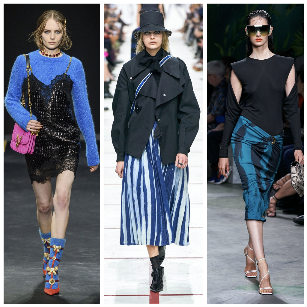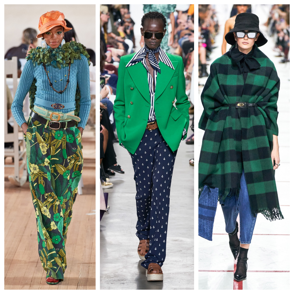 Обратите внимание на то, как органично смотрится темно-синий цвет в сочетании с зеленым у Michael Kors – получившийся образ выглядит сдержанно и подходит для деловых встреч. Также лаконично выглядят и синие джинсы в сочетании с темно-зеленой накидкой на показе Dior.