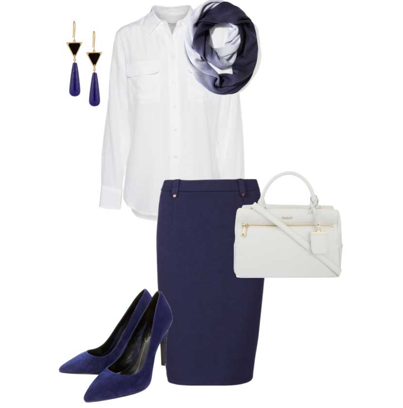 Голубой с белым — классическое сочетание. При помощи блузы и юбки создают романтический лук. Для офисного образа универсально сочетание темного синего и белой блузы строго кроя. Также выбирают: