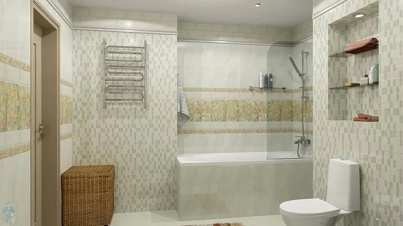 Плитка пастельного оттенка приятного для глаз бежевого цвета имитирует мрамор, а декор и бордюр украшены геометрическим рисунком. Общее впечатление, создаваемое дизайном, это изысканность и утонченность. Спокойная расцветка и лаконичность оформления придутся по душе многим.