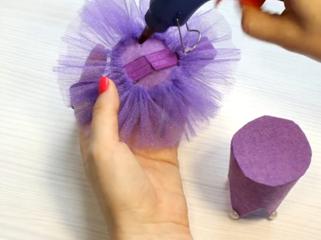 После создания основания можете перейти к изготовлению украшения. Для этого потребуется мелкий кусок стандартной сетки, кусок качественной ткани. За основание можно взять черный и белый цвета, которые всегда в моде. Так, к примеру, можно применять черный бархатный материал и белую сетку. Из этих 2 тканей по очереди сложите банты, потом зафиксируйте их в этом положении клеем. Если вам захочется, выложите их в форме цветков или крыльев бабочки.